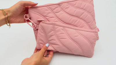 Stay organized with this set of two travel pouches. Perfect for makeup, toiletries, cords, or documents, they pack flat and clip together with a handy carabiner for easy access on the go.